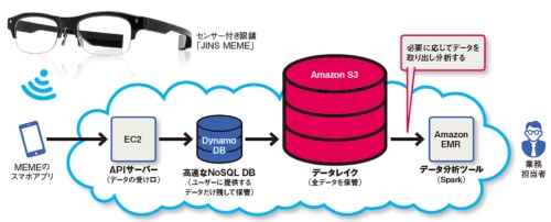 データレイクに蓄積するのはJINS MEMEで生成されるログデータだ。JINS MEMEは加速度センサーや眼球の動きを捉える眼電位センサーなどによって、黒目の動きやまばたき、頭部の傾き・揺れなどを測定し、専用スマホアプリにBluetoothで転送する。ジンズはこのデータを吸い上げ、米アマゾン・ウェブ・サービスの「Amazon Web Services(AWS)」上のデータレイクにためる。ジンズはオブジェクトストレージの「Amazon S3」を使い2017年にデータレイクを構築した。