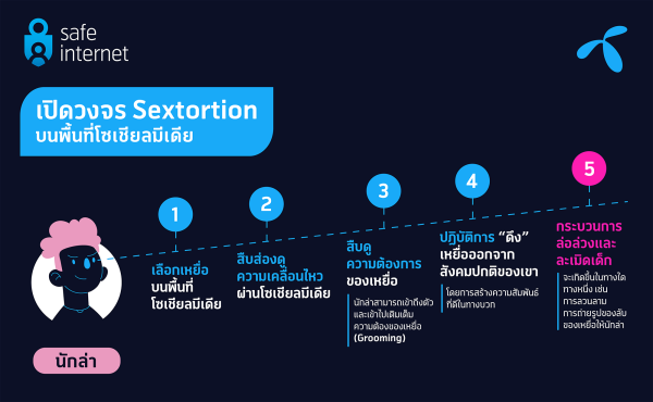 ทั้งนี้ กระบวนการ Sextortion นั้นจะเกิดขึ้นบนพื้นที่ออนไลน์ โดยผู้มีเจตนาในการกระทำผิดหรือ “นักล่า” (Predator) จะเลือก “เหยื่อ” บนพื้นที่โซเชียลมีเดีย เช่น แฟนเพจของน้อง เมื่อเลือกเหยื่อได้แล้ว นักล่าจะเข้าไปสืบส่องดูความเคลื่อนไหวหรือการทำกิจกรรมของเหยื่อที่ทิ้งร่องรอยไว้ผ่านการโพสต์กิจกรรมทางโซเชียลมีเดีย เพื่อสืบดู “ความต้องการ” ของเหยื่อ ทำให้นักล่าสามารถเข้าถึงตัวและเข้าไปเติมเต็มความต้องการของเหยื่อได้ ขั้นตอนนี้เรียกว่า “Grooming” หรือการเตรียมเด็กเพื่อวัตถุประสงค์ทางเพศ