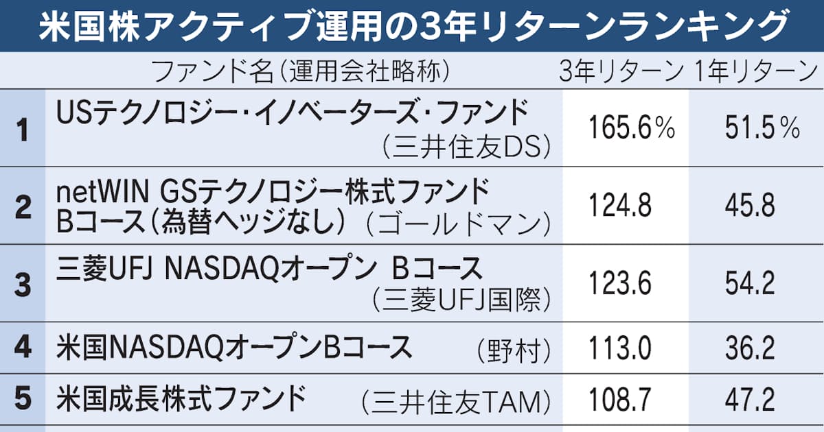上位はテクノロジー関連企業の株式に投資するファンドが目立った。1位は三井住友DSアセットマネジメントが運用する「USテクノロジー・イノベーターズ・...